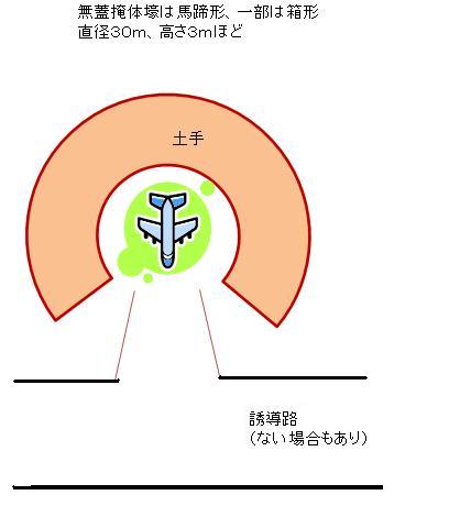 前述のように、印旛飛行場に残る遺構といえば、もはや掩体壕くらいしかない。 では、掩体壕とはどのようなものか。掩体壕は、上にコンクリートなどで固定的な屋根をつけて、ある程度直接的な銃撃、砲撃などに耐え、間接的な爆撃の被害から守るようにした有蓋掩体壕と、周囲を土手で覆い、固定的な屋根がなく、木などで覆って飛行機を隠し、間接的な銃爆撃の被害からのみ救済できる無蓋掩体壕と大きく分けられる。印西にあるのは、無蓋掩体壕のタイプである。形状も、1機のみ隠蔽する馬蹄形のものや箱形のもの、2機まとめて隠蔽するE字形のものがあるが、印西は馬蹄形のものが圧倒的に多い。 掩体壕の幅は約30m、取り巻く土手は約3mと結構高い。通常、そこまで飛行機を運んでくるための誘導路はついているが、飛行場の隅などにあるものはないこともある。周囲はややへこんでいて、まわりから土を取り、土手として積み上げたことが分かっている。 |