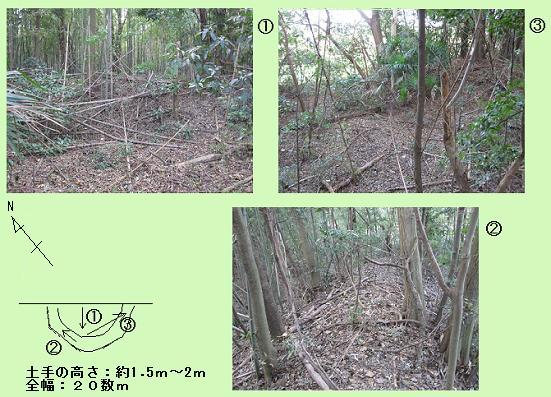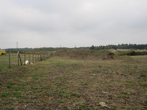 なお、掩体壕は千葉ニュータウンの開発区域にたまたま数基残っているのだが、それから外れていると思われる近隣の藪のなかにも2基ほど残っている。藪の中の掩体壕で、作場道から近い場所にある、以下の写真の1基については、詳細に計測したわけでないが、高さ1.5mから2mほどの土手が馬蹄型にめぐり、幅は20数mとやや小ぶりである。土手の外側は、土手を築くための土を取ったものか、やや低くなっている。掩体壕の内側は土が堆積しているが、ほぼ平坦である。 |