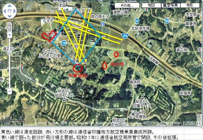 なお、上記の飛行場の滑走路の位置は、最近の研究では、従来言われていたのと実際の位置はかなり異なり、特に東西にのびる滑走路は北西の現在のジョイフル本田のある場所から南東にのびていたことが分かっている。 その新しい研究成果を加味して、飛行場概要を図示すると、以下のようになる。 |