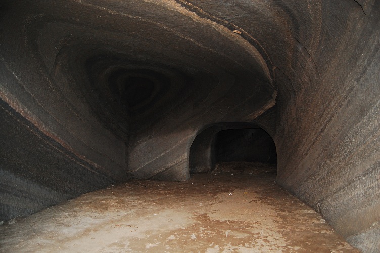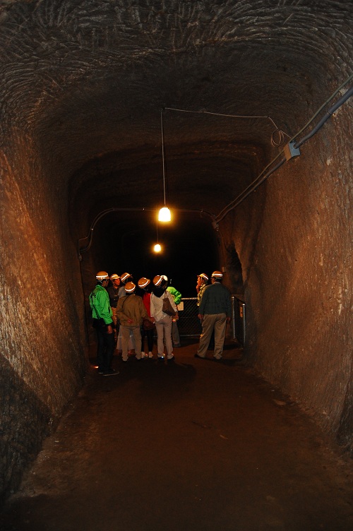 赤山地下壕については、前述の通りであるが、説明を聞きながら実際になかに入ってみると、その大きさを体感することができ、地層が斜めに積み重なっている壕の内面は、どれも同じようであっても、それぞれに役割をもっていることを知ることが出来る。現在も公開されているが、最近では地下壕に入るのは有料になったそうである。わが取材班が入ったおりは、豊津ホールで受付を済ませた後、入壕前から入壕中もNPO法人の安房文化遺産フォーラムの説明員の方に詳しく説明していただいた。 地下壕のなかには、電気室のような場所、奉安殿という場所、兵員が待機したらしい腰掛状の窪みなどもある。司令部壕は比較的大きな部屋となっていて、作りも丁寧なようだ。  |