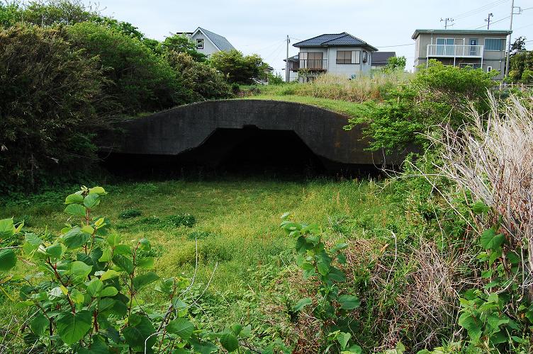 赤山地下壕のある頼忠山の西側、宮城地区の村社熊野神社の近くに、掩体壕が一基のみ存在している。これは鉄筋コンクリート製で、もとは館山市宮城には、終戦時に13基の掩体壕があったという。しかし、戦後様々な事情からなくなって、宮城地区にはこの一基、館山市の他の地区では香に洞窟式の爆撃機用掩体壕が一基あるのみで、館山市内にはわずかに二基しかない。 この宮城地区の掩体壕は零式艦上戦闘機用と思われ、河岸段丘を利用してつくられたものである。 現在、近くには住宅が建ち、掩体壕は野原のなかにあって、駐車場と隣接している。 わが取材班が撮影したのは5月であったが、鳥のさえずりが聞こえ、野原には花が咲き、駐車場を利用するために掩体壕のすぐそばを若い女性が通り抜けるのどかさであったが、戦時中は零戦を秘匿するために兵たちが館空からここまで押していったのである。  |