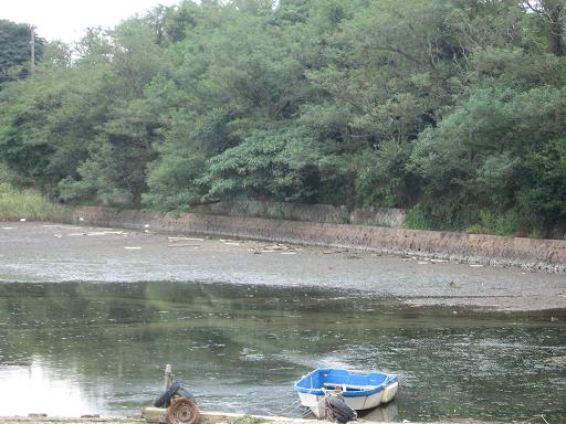 第二河和東側スリップの南に樋門があり、そこに入江があって、白鷺が群れる場所となっているが、そこはかつて故障機、墜落機を台船にのせて運び込むための軍港であった。軍港跡の周囲をぐるりと石垣が築かれているが、二段となっている下段が軍港当時のものである。その軍港跡の西側には、第一航空隊と第二航空隊の連絡用陸橋があったが、現在はその橋脚部分(東側)のみ残っている。 |