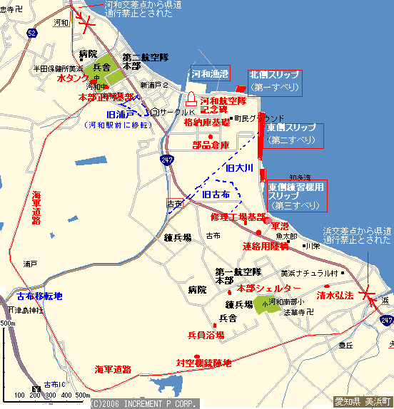 そのような住民の犠牲のもとで開設された、河和航空隊の沿革は、以下の通り。 1941年(昭和16年)、海軍は当時の河和町古布に海軍航空隊を建設し、水上機の基地としようと計画、古布の集落の用地を買収して、古布集落の人々は山間部へ強制移転される(『美浜町誌』によれば、その折衝の際、「買収に同意しない者は非国民である」という海軍側の発言に対し、「今の発言を取り消せ」という住民側の応酬もあったという) 5月 海軍航空隊建設決定(以降、基地建設と古布移転がすすめられる) 1943年(昭和18年)6月、追浜海軍航空隊知多分遣隊開設(整備教育) 1943年(昭和18年)12月、追浜海軍航空隊知多分遣隊は河和海軍航空隊となり、第十八連合航空隊へ編入、丁度同時期に小松島海軍航空隊知多分遣隊が開設さる また古布移転完了 1944年(昭和19年)4月 小松島海軍航空隊知多分遣隊が独立し、第二河和海軍航空隊開設、第十一連合航空隊へ編入(水上機操縦教育で航空艇の搭乗員の養成が行われた)、以降5月に北浦航空隊より予備学生153名、零式観測機の実用訓練のため第二河和海軍航空隊に着任するなど、体制作りが進む 1944年(昭和19年)秋、ガソリン不足のため、飛行訓練が間歇的となり滞る 1944年(昭和19年)12月、南部国民学校校舎、敷地ともに戦時特例により海軍航空隊に強制収用され、西平井へ移転する 1945年(昭和20年)1月、名古屋上空のB29を「強風」33機、2式水戦10機で迎撃するも接敵できず、1月19日強風2機でB29を迎撃、篠島付近で撃墜(米パイロット3名の遺体収容、第二航空隊敷地に埋葬) 1945年(昭和20年)2月26日、第二河和海軍航空隊でも神風特別攻撃隊が編成される(神風特別攻撃隊御楯隊河和隊) 1945年(昭和20年)3月、河和海軍航空隊は第一河和海軍航空隊と改称、この頃米軍B29が頻繁に空襲、2式水戦、「強風」で迎撃するも、高度が高く接敵も困難 1945年(昭和20年)3月17日、鈴鹿海軍航空隊より偵察要員、1期生徒出身少尉候補生30名、特攻機登乗を命ぜられ着任 1945年(昭和20年)6月、米軍機による空襲激しくなり、飛行機を松林に分散して隠す 1945年(昭和20年)7月、米軍機P51などによる空襲ますます激しく、機銃掃射、ロケット弾攻撃を受く、また本土防衛戦のため、鹿島海軍航空隊より「強風」20機、2式水戦8機、搭乗員とともに来る 1945年(昭和20年)8月5日、零式観測機35機と48名の隊員が出撃のため河和から福岡県深江へ移動、8月15日未明特攻出撃命令あるも、終戦のため命令解除 1945(昭和20年)8月15日、終戦、日本は連合軍に敗北し、その後全国の陸海軍部隊は武装解除さる(8月21日、河和練兵場にて解散式、軍艦旗を降ろし焼却) 1945(昭和20年)8月24日、第一、第二河和航空隊員へ復員命令 河和航空基地は、最盛時教育隊に約9,000名、実戦部隊に約3,000名の人員を擁し、飛行機は水上観測機や水上偵察機, 水上戦闘機「強風」など90機を保有していた。 戦後、この河和航空基地跡は農地などになった。内陸部の第一航空隊地区は、土地が払い下げられ、多くは農耕地となった。海に近い第二航空隊の跡地は学校、住宅地になっている部分が多いが、工場設備は都築紡績などに受け継がれ、港湾設備は河和漁港として民生用に転用された。 |