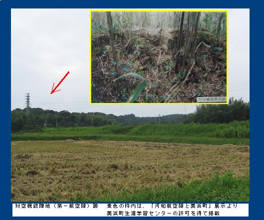 上の写真は、第一航空隊兵舎跡付近から西を向いて撮ったもの。実際の対空機銃陣地は展示の写真のように、山のなかの藪にある。第二航空隊の対空機銃陣地も河和中学校西側の高台にあったが、住宅地などとなり、そちらは遺構がなくなった。 |