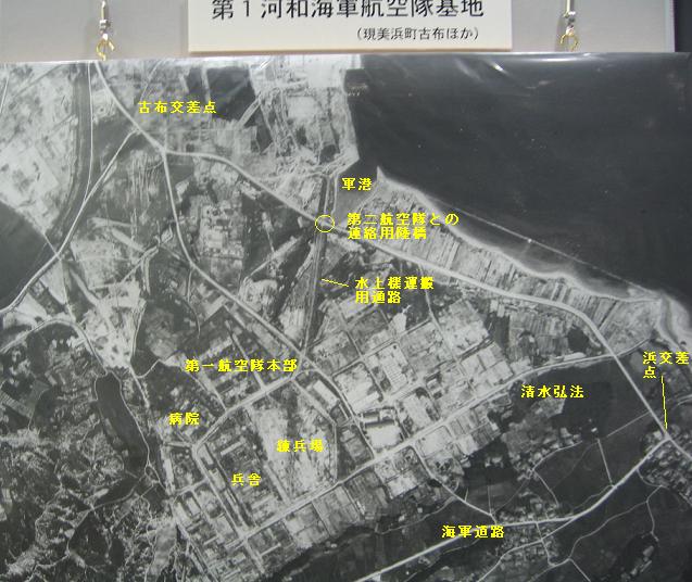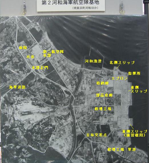 | 第一航空隊は国道247号線の古布〜浜交差点辺りから内陸にはいった場所にあり、第二航空隊は国道247号線沿いの町営住宅河和団地敷地に本部があった。河和漁港から旧都築紡績跡地辺りに、第二航空隊の格納庫や工場などがあり、海岸のスリップが水上機の離発着の場所であった。 その航空隊のかつての姿は、現在断片的にしかわからないが、終戦直後にはまだ原形を留めていた。その航空写真が、今回展示されていた。 <第一航空隊の航空写真>