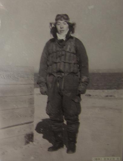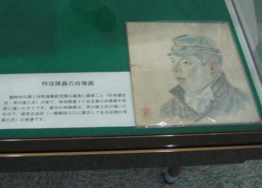 *知多郡美浜町生涯学習センター「河和海軍航空隊と美浜町」展示より (美浜町生涯学習センターの許可を得て掲載) これは、解説に「戦時中の第2河和海軍航空隊の基地に画家二人(杉本健吉氏・早川俊三氏)が来て、特攻隊員35名全員の肖像画を色紙に描いたそうです。展示の肖像画は、早川俊三氏が描いたもの」とあり、特攻隊員であった岩本正治氏を描いたものである。画家二人のうち、杉本健吉氏は2004年に99歳で亡くなったが、岸田劉生に師事した挿絵、写生を得意とした画家で、美浜町に杉本美術館がある。早川俊三氏については、蒲郡出身という以外よく分からないが、白いマフラーも爽やかな航空兵の風貌をよく描いている。 |