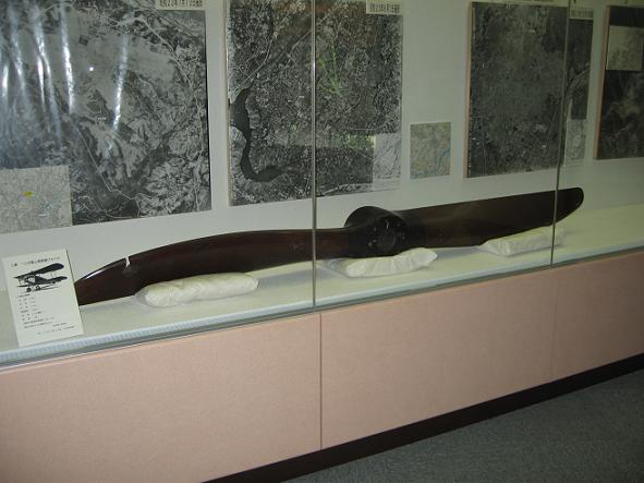 | そのほか、参考展示として、一〇式艦上戦闘機のプロペラ、一三式水上練習機プロペラ(両先端部欠損)が目についた。一〇式艦上戦闘機は三菱製、二枚羽の艦上戦闘機で、300馬力、115ノットの速さで飛び、1927年(昭和3年)までに128台生産された。