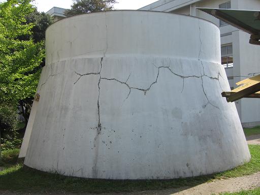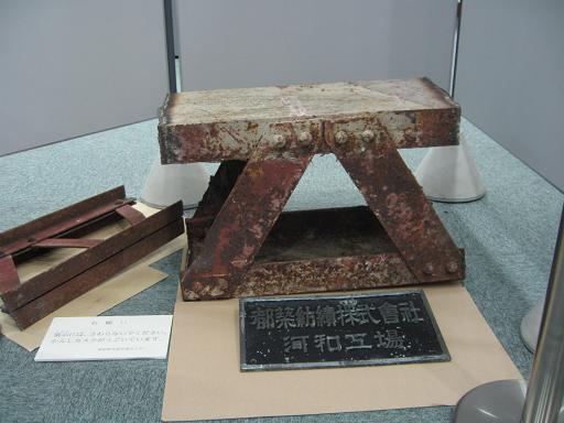 この第二航空隊の遺物として、工場の鉄骨が展示されていた。これは戦後も旧都築紡績の工場として使用されていた工場建屋のほんの一部である。旧都築紡績は既に会社更生法の申請を行い、工場跡地も更地となっているが、辛うじてこのような遺物は残った。 |