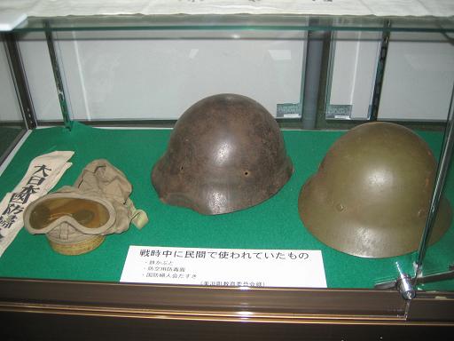 <銃後の暮らしを象徴する鉄カブトや防毒面> |